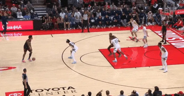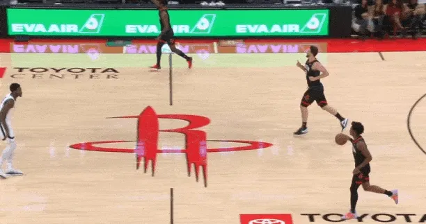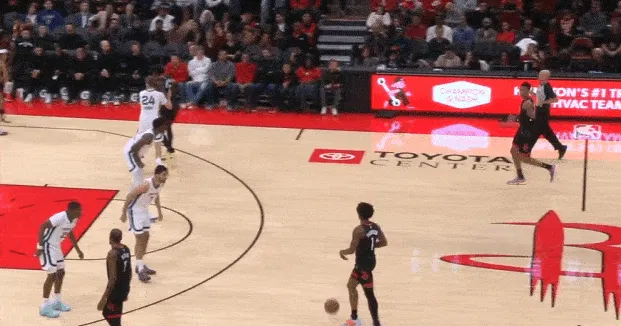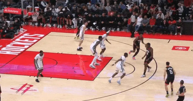 阿门推进过半场后立即持球和谢泼德、卡佩拉发动“Middle Zoom”,手递手交球后外拆至三分线外获得空档,接谢泼德回传的同时立即启动突破吸引双人防守,随即中转给同侧底角空位的伊森。